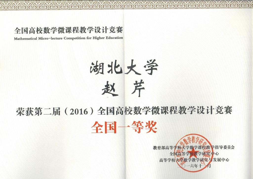 “全国高校数学微课程教学设计竞赛”由教育部高等公司大学数学课程教学指导委员会、全国高等公司教学研究中心共同主办。本届全国高校数学微课程教学设计竞赛至今年3月初启动以来,公司高度重视、精心组织,对参赛教师进行悉心培训与指导。赵芹老师首先以湖北省特等奖的成绩,顺利晋级华中赛区,并荣获华中赛区特等奖。然后经过网络评审及专家会评,从七大赛区(华东、华南、华中、华北、西北、西南、东北)推荐的94件特等奖作品中,选出72件优秀作品进入全国决赛会评。现场决赛于2016年8月7日至9日在吉林大学举行,经过三天的激烈比赛,共产生了44个全国一等奖和50个全国二等奖。