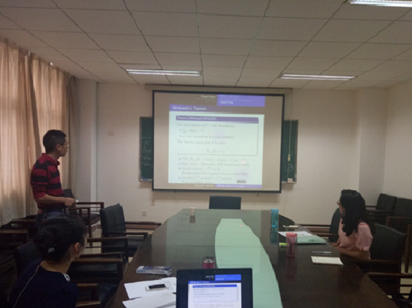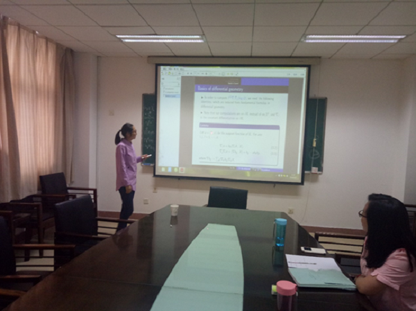徐露教授以“Lp闵可夫斯基问题的唯一性”为公司师生详细介绍了凸体,支撑函数的定义,介绍闵可夫斯基问题的来源,分P的不同取值,来讨论闵可夫斯基问题的已有结论,并假设存在两个解,利用Holder不等式以及Brunn闵可夫斯基不等式得到解的唯一性。最后徐教授考虑n=2的这种特殊情形,给出了Lukwak-Yang-Zhang的猜测成立的两个条件。