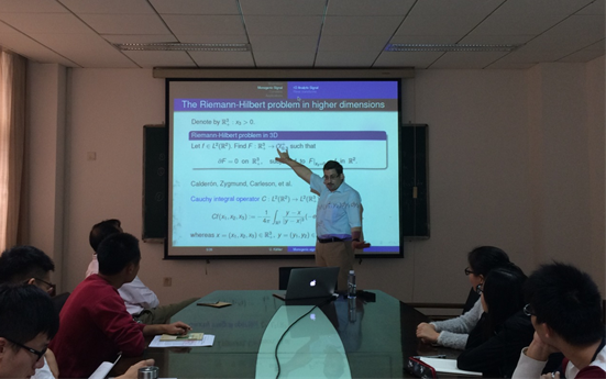 Uwe Kähler教授主要介绍了一种基于医学超声成像的结节检测方法。报告主要论述了一种提高异常边缘检测的单演信号概念的技术,结合放射影像检测的实例,由浅入深的讲述该方法的数学基础,着重介绍如何使用Riesz变换和单演模型来检测图像的“边缘”和“曲线”,进而找出图像中的异常位置。报告结束后,Uwe Kähler教授与师生就报告内容进行了深入探讨。