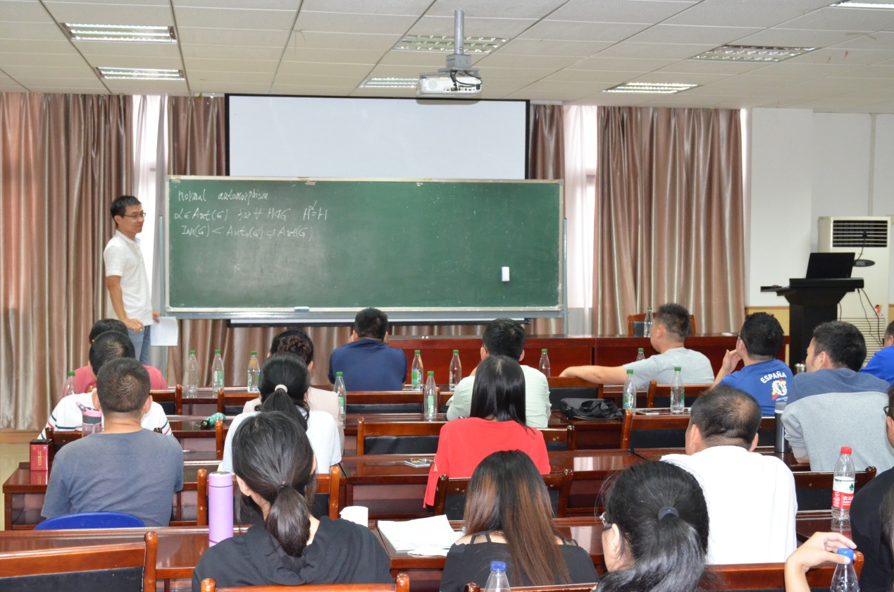 河南工业大学王玉雷副教授做了题为“有限群的交换度和相对交换度”的报告。王教授首先介绍了交换度的相关概念,然后讨论了有循环Frattini子群的有限p-群的交换度,接下来给出相对交换度的相关概念,及有限群的自交换度和相对自交换度的一些例子,最后介绍了广义超特殊p-群相对自交换性的几个定理。