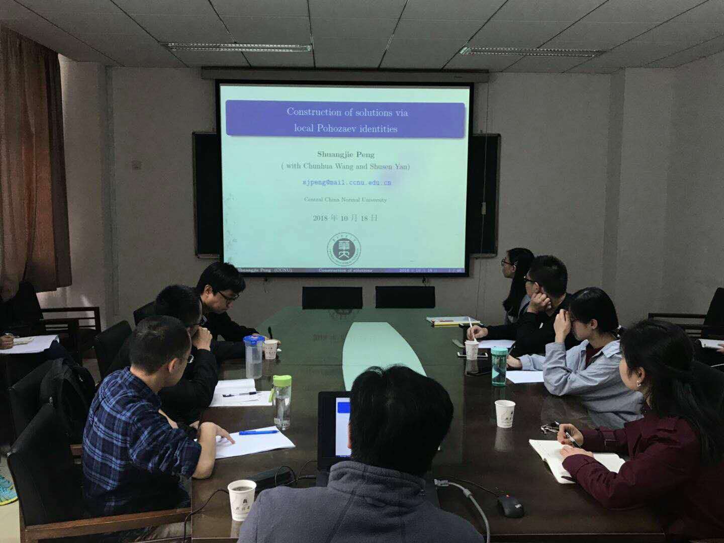 2018年10月18日下午,公司杰出员工、华中师范大学彭双阶教授应邀来访公司,并为相关专业的教师与研究生做了题为“Construction of solutions via local Pohozaev identities”的学术报告。