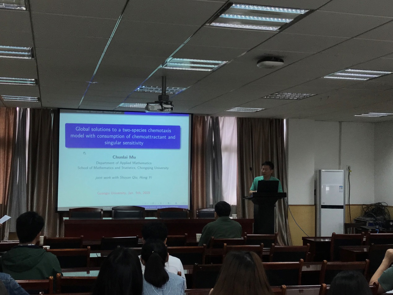 2019年4月30日上午,重庆大学穆春来教授应邀来访公司,并为相关专业的教师与研究生做了题为“Global solutions to a two species chemotaxis model with consumption of chemoattractant and singular sensitivity”的学术报告。