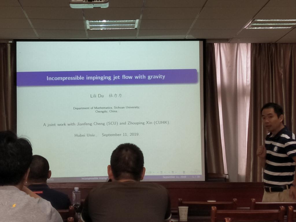 报告中,杜力力教授介绍了与Incompressible impinging jet flow with gravity相关的一些问题,并围绕相关问题与参会师生进行讨论交流。参加报告的师生与杜力力教授讨论了一些相关专业的问题,开拓了自身眼界。