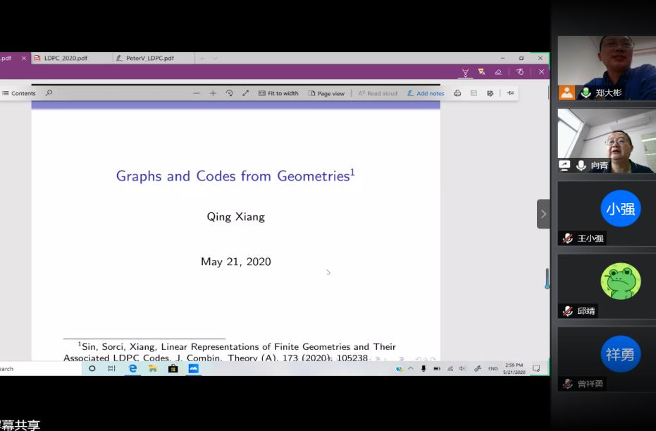 2020年5月21日下午,美国特拉华大学(University of Delaware)向青教授为公司部分老师和研究生带来了一场精彩的线上学术报告,报告通过腾讯会议在线举行,旨在帮助同学们理解几何、编码和图之间的关系。郑大彬教授主持本次会议,yl34511线路中心经理曾祥勇教授以及数十名研究生参与报告的听取、讨论。