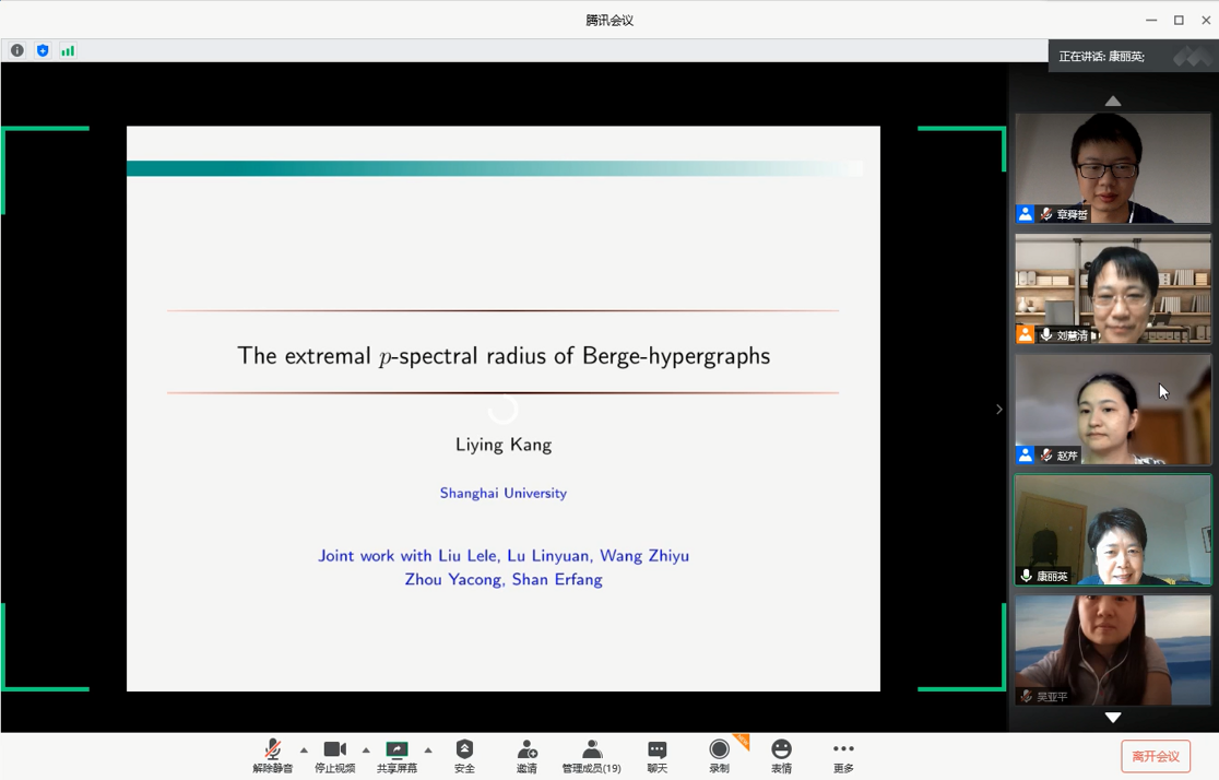 报告结束后,康丽英教授就师生们提出的问题给予了详细的解答,与师生们讨论了其他图类的3一致Berge超图最大的p谱半径问题。最后,刘慧清教授对本次报告进行了总结。整个报告过程持续了两个小时,线上报告和交流互动热烈。