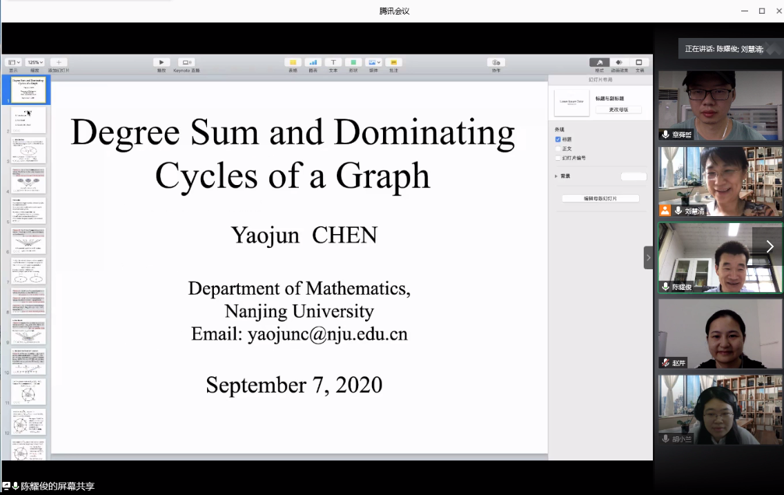 陈耀俊教授在报告过程中,重点介绍了新的证明方法和技巧,这为进一步解决相关猜想提供了新的思路。报告结束后,陈耀俊教授就师生们提出的问题给予了详细的解答,并将线上报告的详细证明过程与师生分享。最后,刘慧清教授对本次报告进行了总结。整个报告过程持续了两个小时,线上报告和交流互动热烈。