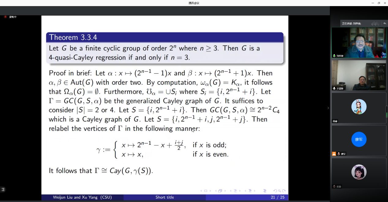 刘伟俊教授做了题为“广义凯莱图的自同构”的报告,报告首先介绍了广义凯莱图的基本性质,然后定义了GCI群,讨论了交换群和二面体群的GCI性。