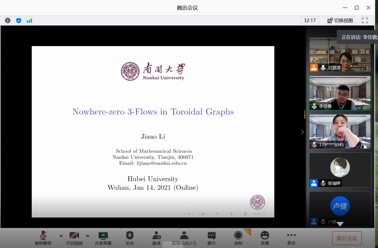 李佳傲老师的报告题目是《Nowhere-zero 3-Flows in Toroidal Graphs》,李佳傲老师首先向大家介绍了报告相关的概念,接着就向大家报告了他们团队关于3-Flows问题的研究成果。