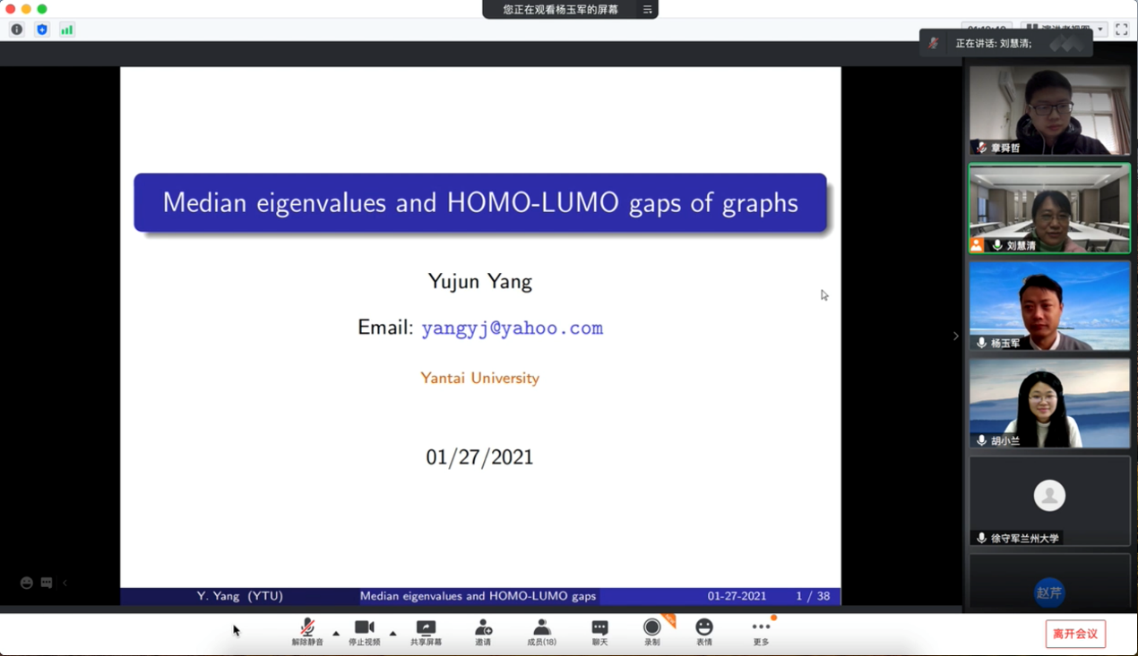 杨玉军教授的报告题目是《Median eigenvalues and HOMO-LUMO gaps of graphs》,杨玉军老师首先向大家介绍了报告相关的概念,接着就向大家报告了他们团队关于图的median eigenvalues和HOMO-LUMO gaps的研究成果,并且在最后与大家进行热烈的讨论。