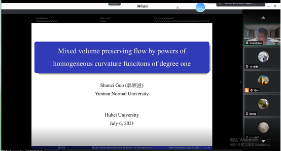 2021年7月6日下午,云南师范大学郭顺滋副教授应邀为公司相关专业的教师与研究生做了题为“Mixed volume preserving flow by powers of homogeneous curvature functions of degree one”的线上学术报告。