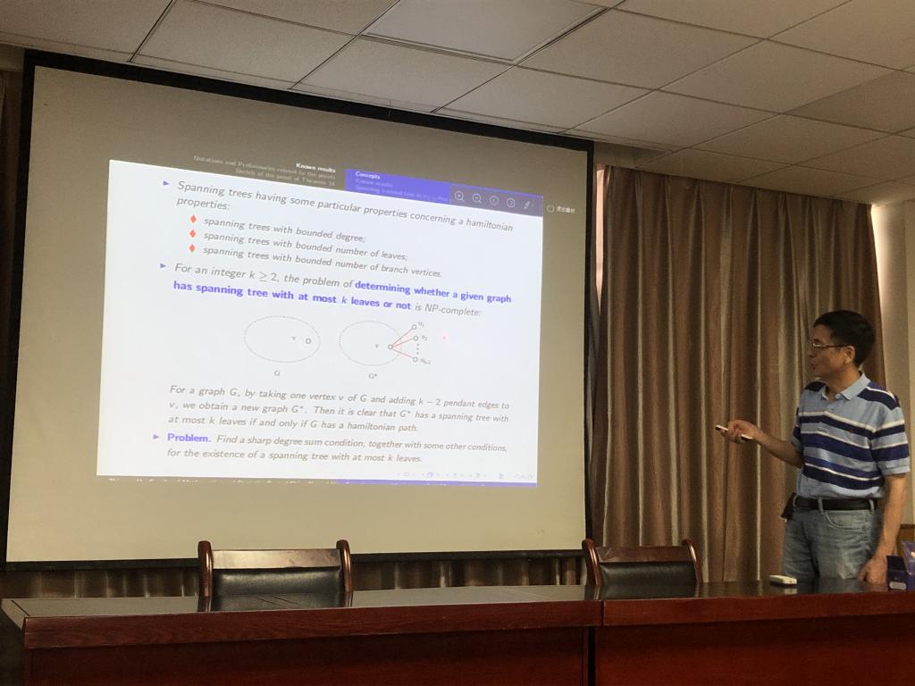 报告中,胡智全教授首先介绍了给定叶子点支撑树的相关研究背景,然后在此基础上介绍了连通K_{1,5}-free图存在至多k个叶子点支撑树的度和条件,并且举例说明了这个度和条件是最好可能。在胡智全教授报告结束后,老师们就相关问题进行了讨论。
