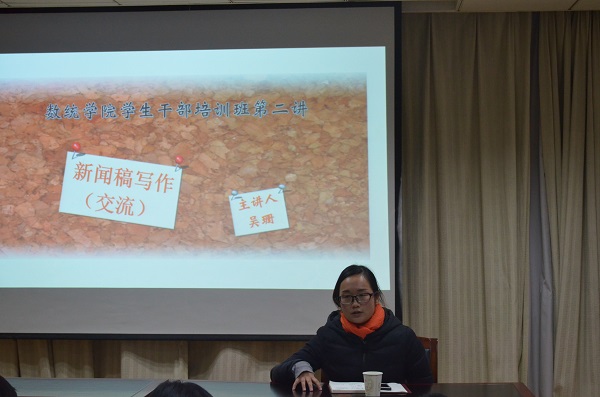 吴珊老师讲到了校内校外的宣传情况和发表的渠道,校内主要以校报和新闻网的形式来发表文章和稿件,阐述了写好一篇新闻稿有哪些要素,结合自己的经历和见闻讲述了要寻找到在这些活动中的有特色的人物,经历,感受和故事。吴珊也就新闻写作给大家提出了三条建议:一是要了解自我,充分的挖掘具体的有趣的故事;二是要多多投稿,多多练习,笔耕不辍;三是要图文并茂,加入一些有趣的图片吸引大家的阅读兴趣。