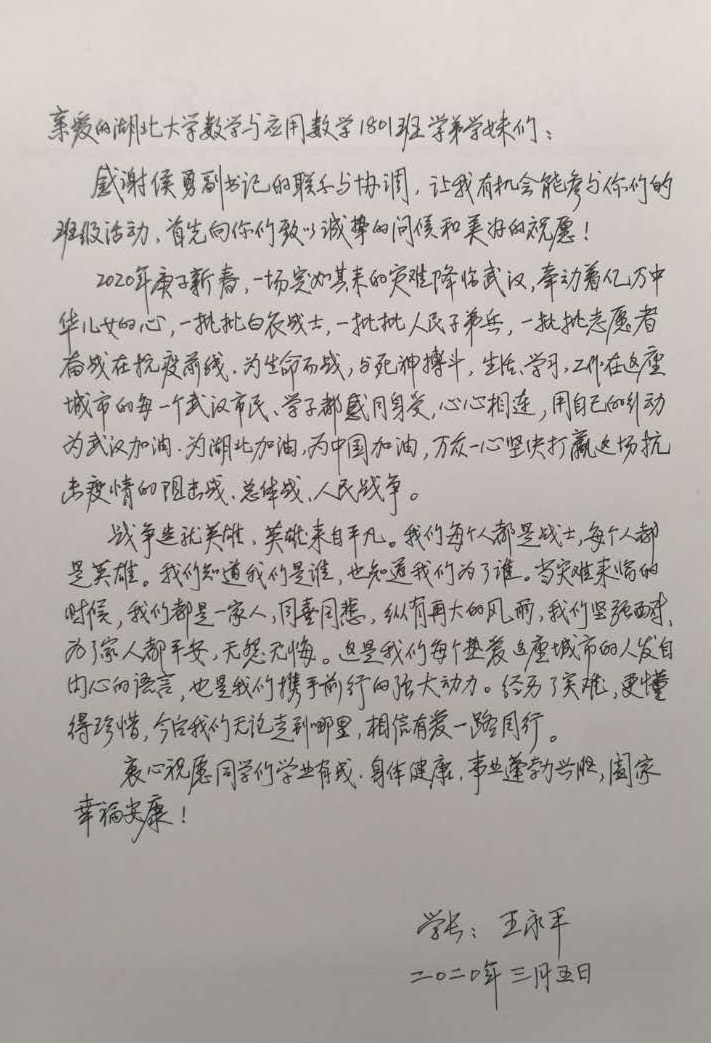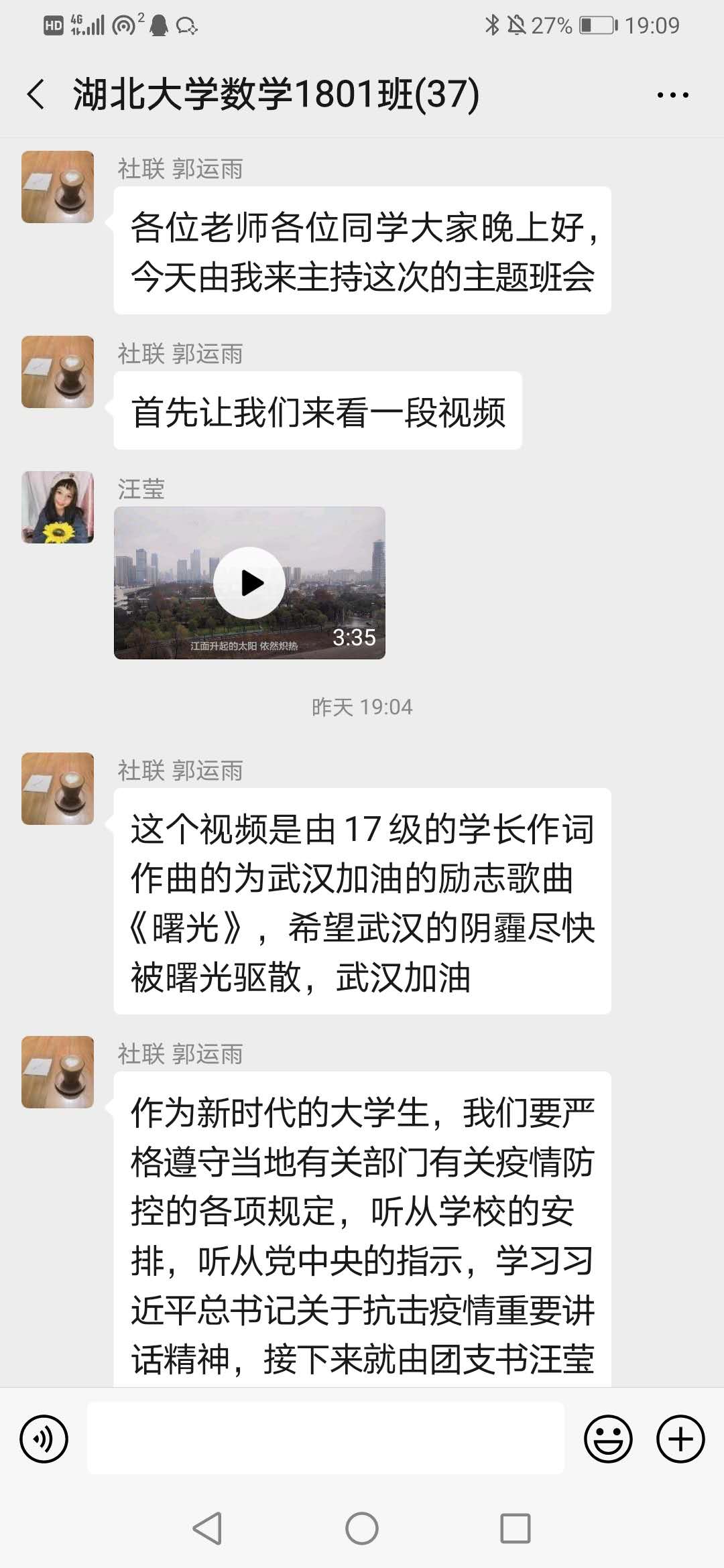 “别问我是谁,别问我为谁,我们都是一家人,同喜同悲。不管有多苦,不说有多累,风雨一定会过去坚强面对。”这是公司党委副书记侯勇将现任湖北省文联副主席的王永平员工作词的全国抗疫优秀公益歌曲《知道我为谁》带入到主题团日活动中,用于激励员工们携手共进,共抗疫情。3月5日晚,侯勇参加了yl34511线路中心数学与应用数学1801班召开的以“开展云团日,厚植爱国心”为主题的团日活动。公司党委书记万路路、经理曾祥勇出席活动,公司党委副书记、班主任、辅导员也全程参与了活动。
