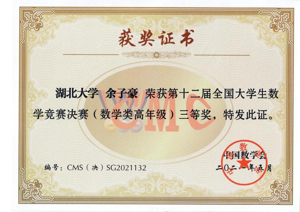 第十二届全国老员工数学竞赛初赛于2020年10月举行,由各省(市、区、军队院校)数学会负责组织,使用全国统一试题同一时间进行考试。参加初赛报名人数量206921人,赛区32个,高校897所。经激烈角逐,在与全国优秀员工同台竞技的过程中,余子豪同学沉着冷静,表现出色,荣获此次决赛数学类高年级组三等奖。